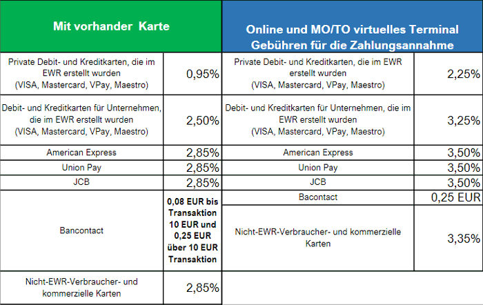 Keine Grundgebühren, aber doch Transaktionsgebühren – so lässt sich das Kostenmodell von myPOS zusammenfassen. MyPOS unterscheidet bei den Transaktionsgebühren zwischen solchen für Kartenzahlungen und virtuellen Zahlungen, zudem zwischen Zahlungen von privat oder Unternehmen. Bei privaten Debit- und Kreditkarten (VISA, Mastercard, VPay, Maestro) aus dem EWR fallen die schon genannten 0,95 % Gebühr an – die geringste Gebühr. Die höchste Gebühr (3,5 %) nimmt myPOS für virtuelle Zahlungen mit American Express.