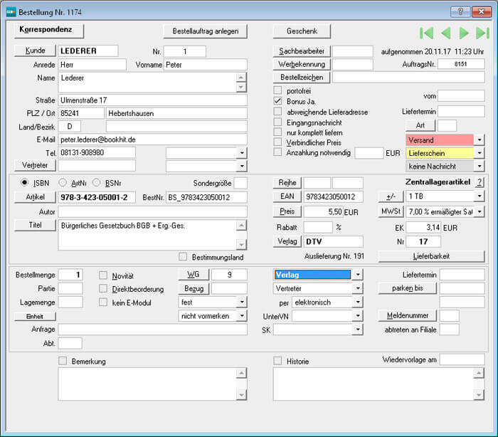 Das Bestellfenster der Kassensoftware bookhit zeigt umfangreiche Artikel-, Liefer- und Kundendaten sowie für den Buchhandel relevante Einstellungen (Artikelauswahl über ISBN, reduzierte Mehrwertsteuersatz u. a.) Bild: Screenshot Webseite bookhit